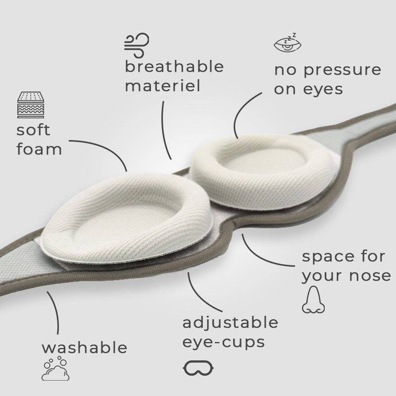 The REM sleep mask is designed for uncompromising comfort and made with super soft, breathable materials that adapt to your face without putting pressure on your eyes. It ensures a deeper sleep, regardless of whether you lie on your back, side or stomach.